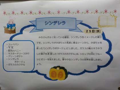 今日の給食 公開日 2023/01/25 更新日 2023/01/25 給食室より 今日の給食は、コッペパン、豚肉のハニーマスタードソースかけ、グリーンポテト、シンデレラポタージュ、ガラスのカクテル、牛乳でした。ハニーマスタードソースかけは、新しい味付けで子ども達に人気でした。ガラスのカクテルは、キラキラ見た目も鮮やかでおいしかったです。