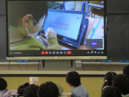 1年生は、司会進行をしたり、Meetで授業の様子を見てもらったり、校内を案内して回ったりしています。保健室や職員室などを紹介しながら、説明をしていました。