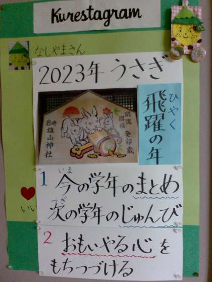 校長室の前にkuresutaguramuが掲示してあります。今年は、2023年、うさぎ年です。3学期は、次の学年に向けて準備をする期間です。
