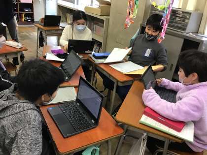 呉羽のたからを2年生に伝えるために、スライドづくりをしています。「分かりやすく」「楽しく」伝えるにはどうすればよいかを考えながら作っています。
