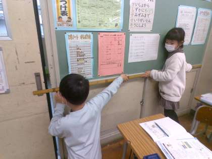 昨日、床から体のどこまでが1mなのかを確認したので、およその長さを想定しながら取り組んでいました。学びを生かして学習する子供たちです。