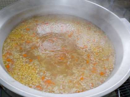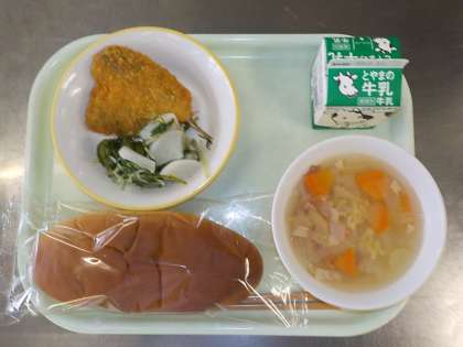 今日の献立は、黒糖コッペパン、あじフライ、かぶのサラダ、マカロニスープ、牛乳でした。サクッと揚がったあじフライ、ベーコンのうまみたっぷりのマカロニスープには、数字やアルファベットの形のマカロニが入っており、楽しみながら食べる様子が見られました。