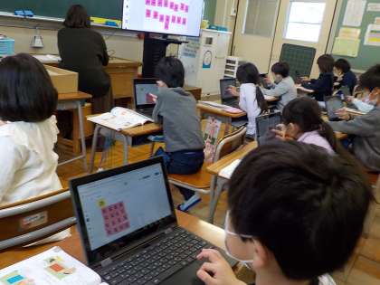 クロムブック上に複数の付せんを並べてビルの形をつくります。同じ枚数の付せんを使っても、組合せ方によって形の違うビルができあがることや、ビルに用いた付せんの数を式に表して求めたりしました。