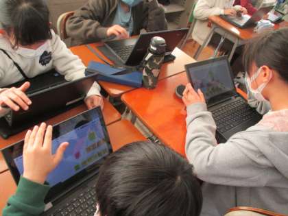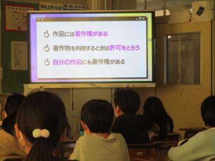 子供たちは情報モラルについて学びました。著作権をテーマに、動画を視聴し、他人の著作物に対してどのように関わっていくべきかをグループごとに考えました。一人一台端末は、調べたりまとめたりするためにとても便利である反面、自分たちでモラルをもって上手に活用していく必要性について考えました。