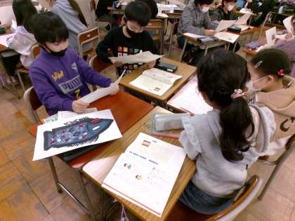 今日は国語科で、これまで図画工作科で作った作品をしょうかいする文章を書き、友達と読み合いました。「内容が分かりやすいね」、「家の人の感想も入っていていいね」などと感想を交流していました。