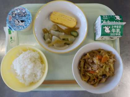 今日の献立は、ごはん、厚焼き卵、茎わかめの酢の物、回鍋肉、ヨーグルト、牛乳でした。茎わかめの酢の物は、コリコリとした食感の茎わかめが甘酸っぱいタレとよく染みて食べやすかったです。回鍋肉は、野菜がたっぷり入った赤味噌風味でとてもごはん合い、おいしくいただけました。