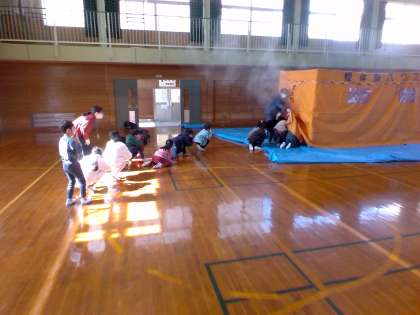 子供たちは、消防署の方が用意してくださったテントの中を低い姿勢で通りました。