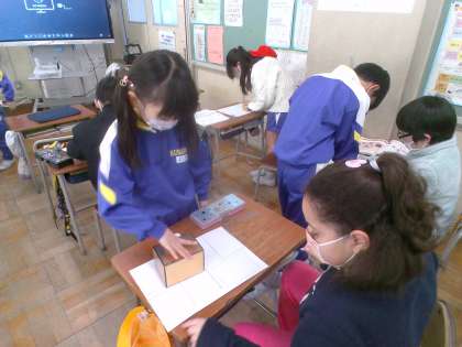 算数科で、自分で選んだ箱を画用紙に写し取り、面の形や数を調べました。