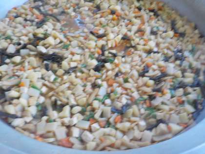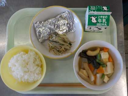 今日の給食は、ごはん、さばの銀紙焼き、ごまびたし、関東だき、牛乳でした。さばの銀紙焼きは、子ども達の人気メニューの一つで銀紙焼きの中身は、さばのみそ煮です。ごはんと一緒に食べている人が多かったです。関東だきも、具だくさんでおいしかったです。