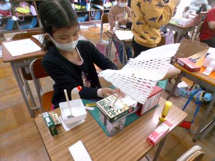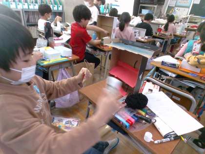 図工の時間に、いろいろな箱を使って小さな友だちが喜びそうなハウスを考えました。子供たちは、「ハウスの中に何があると楽しいだろうな」と想像しながら作っていました。