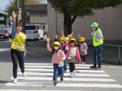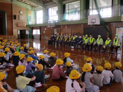 呉羽交番や交通安全協会の方々、交通安全母の会のみなさんの協力を得て、学校周辺の実地指導を行いました。横断歩道の歩き方や歩道橋、歩道のない道の歩き方を学び、一人一人が自分の命は自分で守る意識を高めることができました。