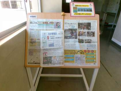 図書室前にある新聞です。毎日新聞が更新されています。小学生でも読みやすいように、読み仮名がついている新聞もあります。2学期からは7社から新聞が届くようになり、たくさん読むことが出来ています。ぼくは、今まで読んだことがなかったのでこれから休み時間などに読んでいきたいです。