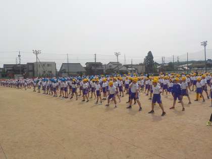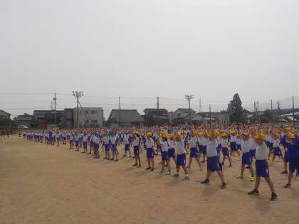 3・4年生のリードの元で全員の相撲体操です。元気なかけ声がグラウンドに響いています。