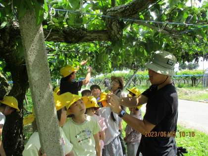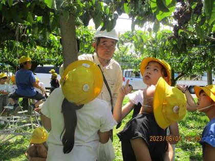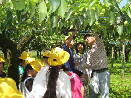 摘果体験を行いました。地域の方に教えていただきながら、摘果する実を真剣に選んでいました。