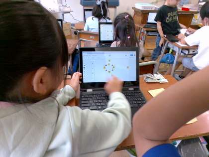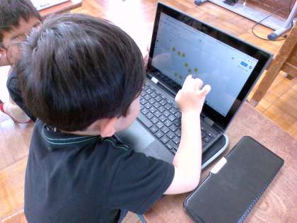 鬼遊びでけいどろをしている1年生。「どうしたら けいさつが かてるかな?」「たくさん どろぼうを つかまえるために どうしたらよいかな?」などを考えていました。クロムブックを上手く活用し色々な作戦を立てました。