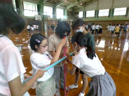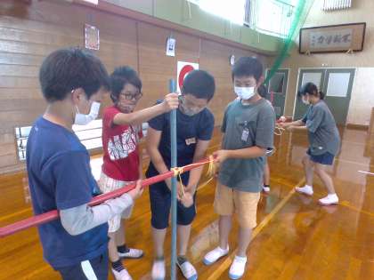 立山青少年自然の家から所の方に来ていただき、所の使い方や、ピザ作り、森の遊び場作りについて話をしてもらいました。最後には「かく縛り」の練習をし、宿泊学習当日に向けて準備万端となりました。学習学習が楽しみですね。