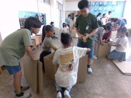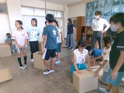 先週、ダンボールでベッドとパーテーションを作りました。今週は、その他にあったらいいものを自分たちで考え、机といすを作りました。強度を高めるこつを知り、丈夫な机やいすを作ることができました。
