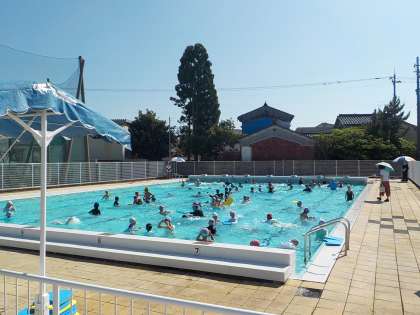 夏休みが始まり、多くの子供たちがプールに来ています。しっかりとみんなでラジオ体操を行い、熱中症や安全に気をつけてルールを守りながら楽しく泳いでいます。