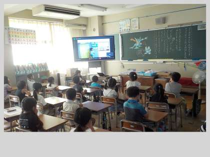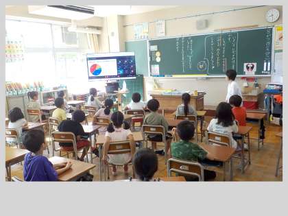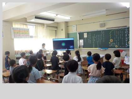8月28日、子供たちが元気よく登校してきました。始業式はMEETで実施しました。校長先生からは、夏休みにがんばっていた子供たちの様子を紹介した後、学校アンケートをもとに、もっと自分のよいところを増やすために、自分に関する力(意欲、忍耐力、自制心)と人と関わる力(思いやり、協調性、共感する力)について話をしてくださいました。取材をした1年生教室では、どの子もぴかぴかの笑顔で校長先生の話に耳を傾けていました。その後、子供たち全員で校歌を斉唱しました。
