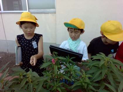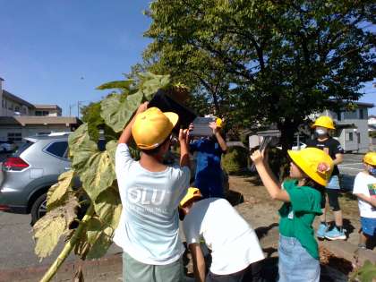 ホウセンカやヒマワリの観察をしました。「どこに実がついているのかな」とじっくり観察をする子どもたちです。