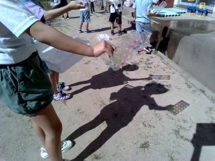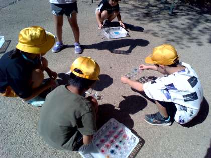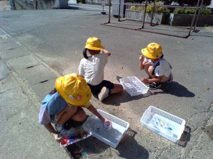 太陽の光を利用して、透明プラスチックに色をつけて光を通してみました。外に出るなり「わあ、きれい」と声を出していました。水を入れたり、重ねたり、友達と合わせてみたりして楽しみました。