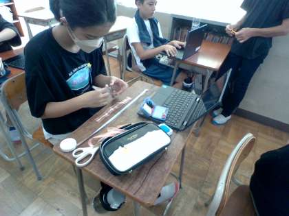 6年生は総合的な時間の学習でSDGsについて学び、行動に移そうと取り組んでいます。いくつかのグループが「家にあるいらない物でリメイク品を作ったらよいのではないか」と考えました。そして。まず6年生に呼びかけ、みんなで作ってみました。作ってみると楽しく、仕上がった作品も出来栄えがよく、「バザーで売ってみよう」という声も上がっています。何事もやってみることで気付きや学びが生まれるということを実感した1時間でした。