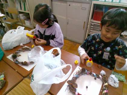 子供たちが大切に育てたアサガオのつるや校外学習で拾った秋の実を使って、リースを作りました。どのリースもとても素敵でした!
