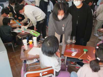 1年教室では、自分たちがつくったおもちゃで、6年生が楽しく遊ぶ姿が見られます。