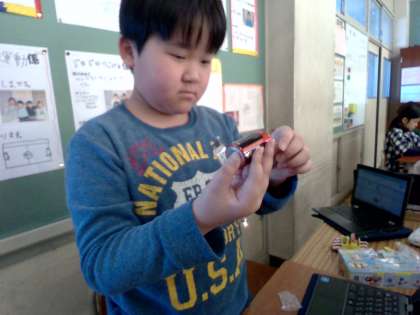 理科の学習で、豆電球と乾電池でどのようなつなぎ方ならば明かりがつくのかを考えました。つなぎ方を予想し、予想をもとにして実験をしました。友達と協力しながら楽しく実験に取り組む姿も見られました。