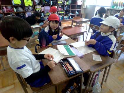1年生は、国語科で「ともだちのこと、しらせよう」の学習をしています。友達に、「今一番楽しいこと」を聞き、さらにもっと知りたいと思ったことを質問したり、感想を伝えたりしました。そして、聞き取ったことをもとに、分かりやすく文章にまとめました。