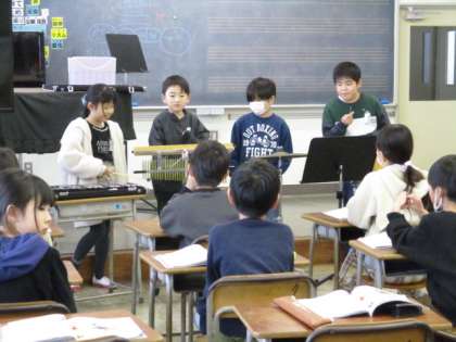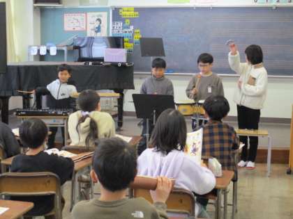 音楽科の学習では、4種類の楽器を使って「魔法」のような音を奏でました。友達と話し合って音の大きさやリズムを工夫して演奏しました。楽器が奏でる音のよさを感じながら楽しく取り組んでいます。