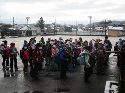 元気よく、富山市子どもの村へ出発しました。雪も降り、環境はバッチリのようです。そり遊びや雪像づくり、かんじきハイクを楽しむ予定です。