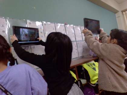 1年生では、図工の時間に「すきまちゃんのすきなすきま」の学習に取り組みました。隙間テープで作ったかわいい「すきまちゃん」をいろんな隙間に置いて、クロムブックで写真を撮りました。そして、「すきまちゃん」がお話していることを考えて書きました。