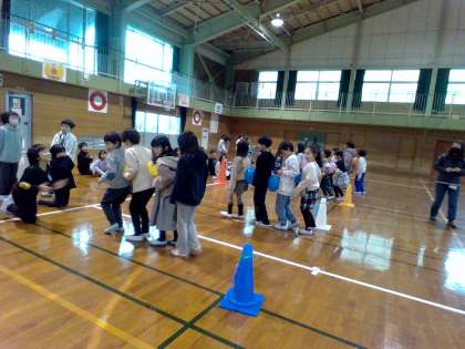 呉羽っ子タイムに3回目の「2年生もっとなかよくなろう集会」をしました。今回は2組の子どもたちが司会進行をしました。各クラスの友達と「よろしくね」と挨拶した後、3、4人で一緒に「風船むかでリレー」をしました。風船が落ちないようにそっとゆっくり歩いたり、声をかけたりしてみんなで楽しみました。
