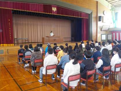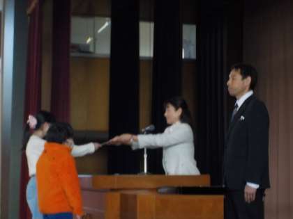 15日、6年生は修了式を行いました。校長先生から代表児童に修了証が授与されました。「校長先生はいつまでも皆さんの応援団です」