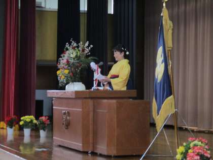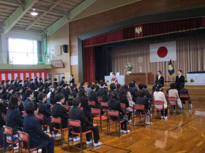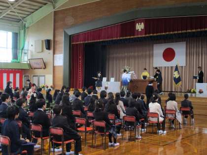 卒業証書授与では、担任の先生の呼名に返事をし、校長先生と目を合わせながら卒業証書を受け取っていました。式辞では、校長先生が渡辺和子さんの著書「置かれた場所で咲きなさい」を引用し、それぞれの場所で精一杯の花を咲かせることが大切なことを、はなむけの言葉として投げかけられました。卒業生は、多くの人々からの励ましの言葉や拍手に包まれながら、巣立っていきました。