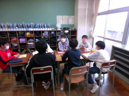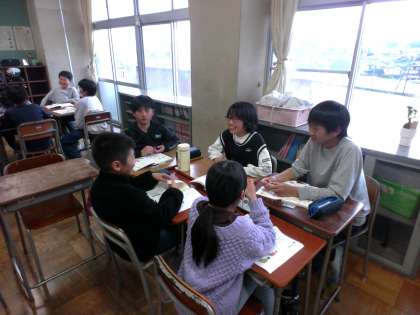 国語科の学習では、グループになって楽しい話をつなぐ活動をしました。最初と最後の一文を決めて、一人一文担当して、楽しく話をつくることができました。