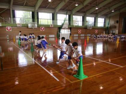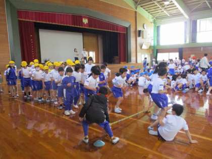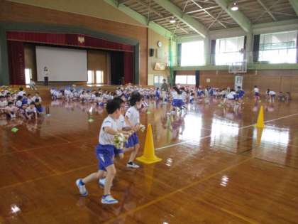 スポーツフェスティバルに向けて、3,4年生合同で台風の目の練習を行っています。どうしたらより早くゴールできるかを考えながら取り組んでいます。