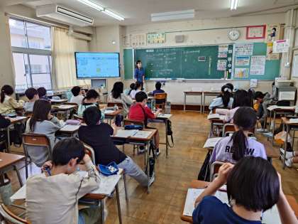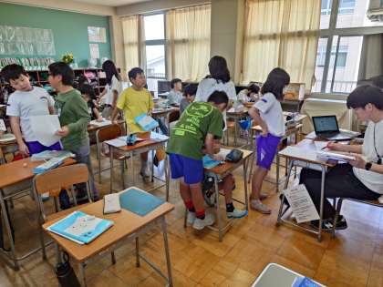1組 算数科の授業風景です。立体の体積の求め方について学んだことを活かして、発展課題に挑んでます。