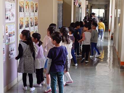 職員室前を「たんけん」している様子です。 見るもの全てに興味津々です。
