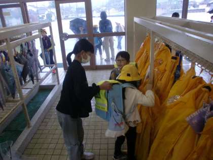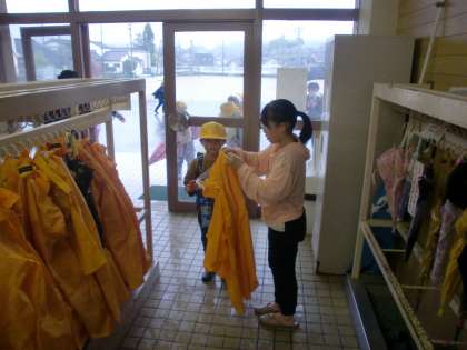 雨の日の朝は、1年生玄関に6年生が立ち、雨具の着脱のお手伝いをしています。目線を低くし、優しく話しかけながら手伝う様子が見られました。