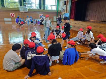スポーツフェスティバルについて学年合同で団ごとに話合いを行っています。