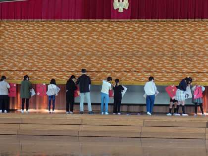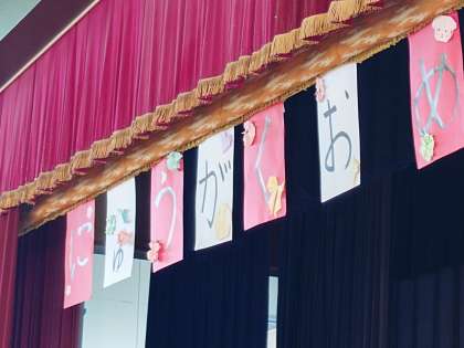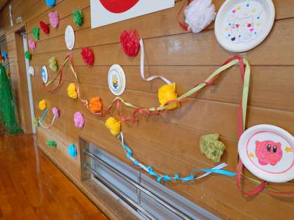 壁面にはられていたお皿の飾りは、集会が終わったあとで、6年生から1年生にプレゼントされたようです。