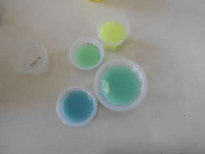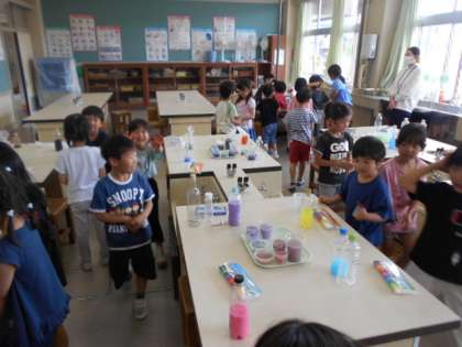 いろみずあそびをしました。みんなの色水を鑑賞している様子です。楽しく活動していました。