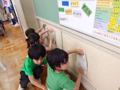 1年生のそうじを見ていたら、そうじの終わりに不思議な作業に取り組んでいるのが目に留まりました。