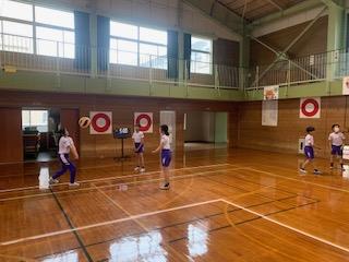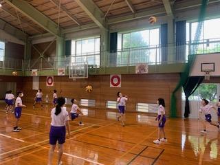体育の学習では、ビーチボールをしています。毎時間、各チームの課題をもとに練習メニューを考え、試合に臨んでいます。今日も、サーブやスパイクなど、班で練習しながら目当てをもって活動しました。