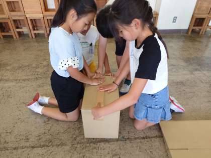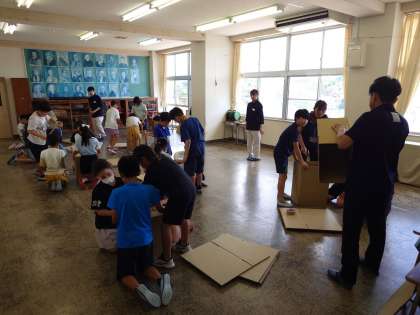 段ボールを活用した机づくりの体験を下にして、様々な年代や立場のことを考えて備えておく大切さを子供たちは学んでいました。このことは2学期以降に展開する、探究課題とも密接につながってくるはずです。