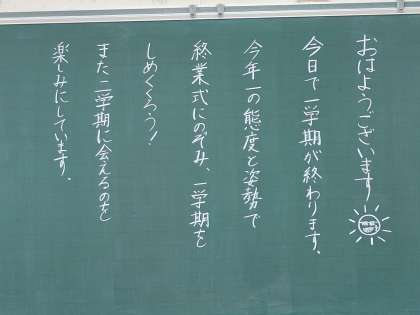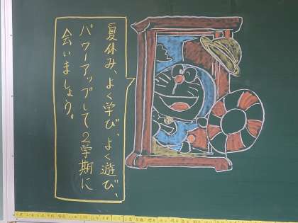朝、教室を回ると、1学期最終日の迎え入れメッセージが黒板に示されていました。