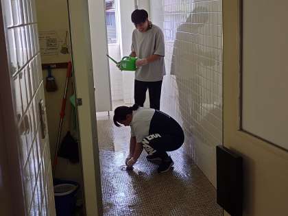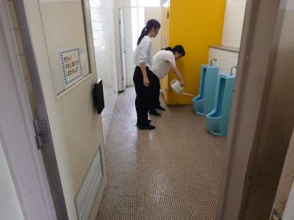 研修の後は、校舎内のトイレを手分けし、子供の手では届かない箇所のの清掃に汗を流しました。夏季休業中もこのように二学期に向けて、いろんな箇所のメンテナンスを進めていきます。