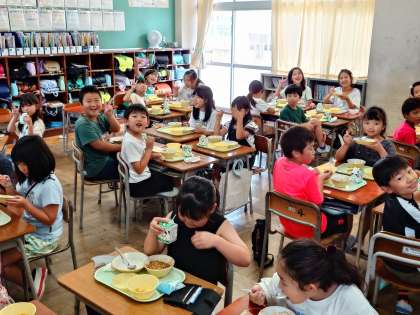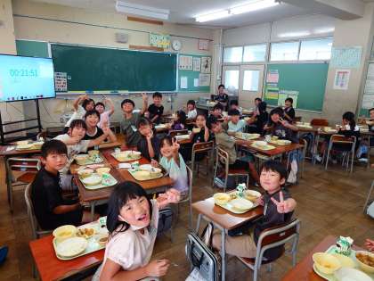 どんどんおかわりをしている3年生。元気いっぱいに食べていました。
